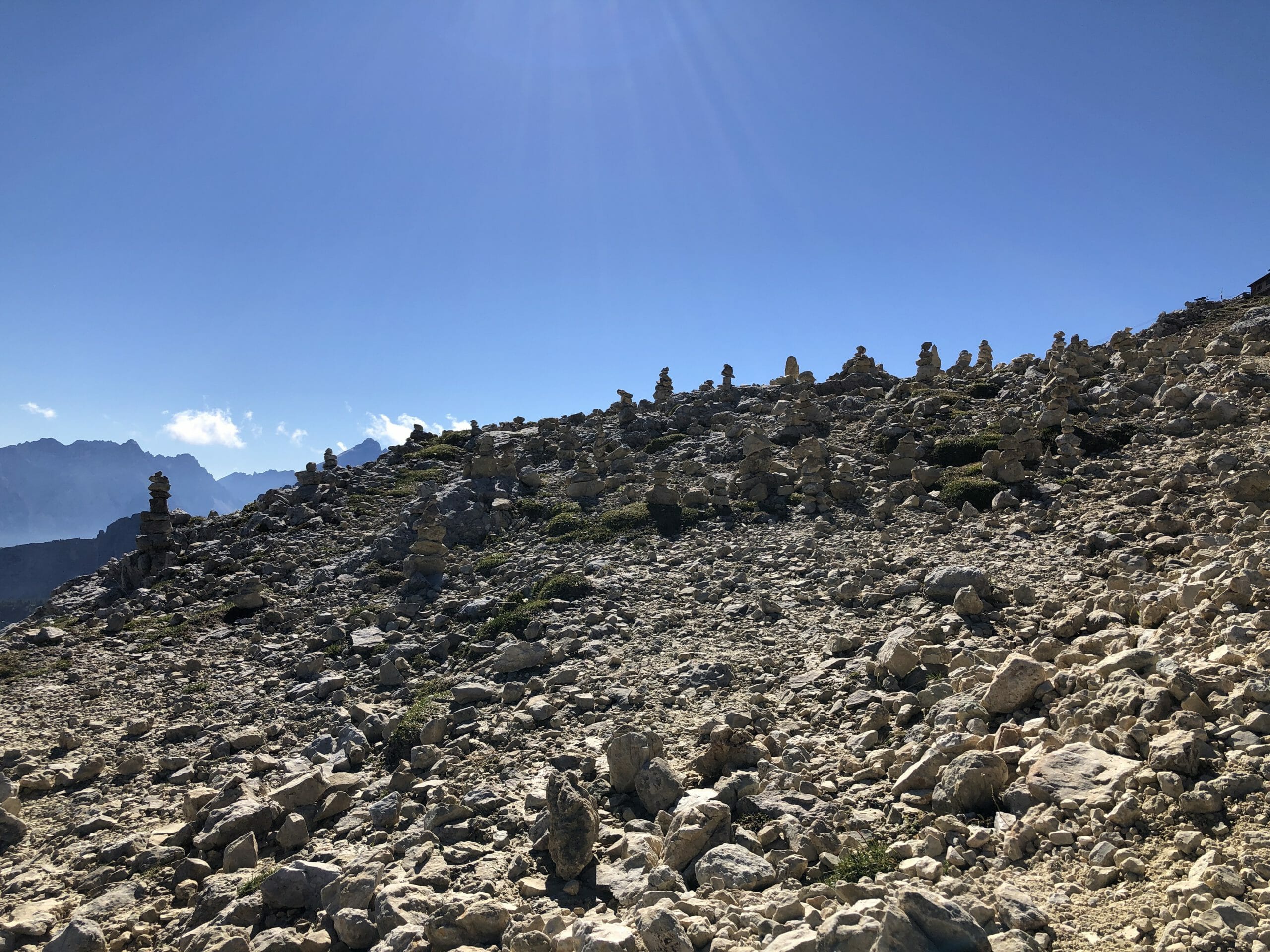 Per noi tempo per qualche foto, timbro di rito sulla cartina e ci si rimette in marcia alla volta del Rifugio Nuvolau. Seguiamo il sentiero, poco segnato, 439 e, passata la Forcella Nuvolau ci troviamo su un tratto che sale tra ghiaia e roccia.